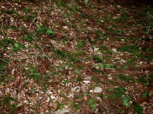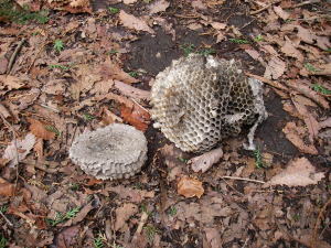| 前日の強い風で落ちた檜の葉と蜂の巣。道には枯れ枝がたくさん落ちていて、歩くのにじゃまになりそうなものは片付けながら歩いた。 |