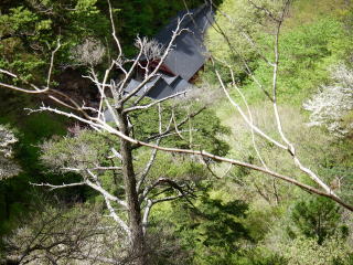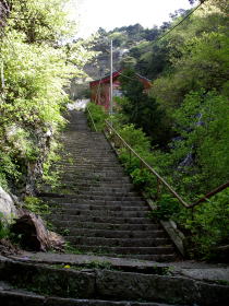 | 本堂の後に見える落差140mの男滝の落ち口に続くらしい道が本堂の左手にあったので、予定より早く大滝不動尊に着いたので行ってみることにする。 |