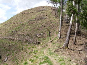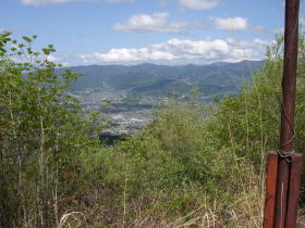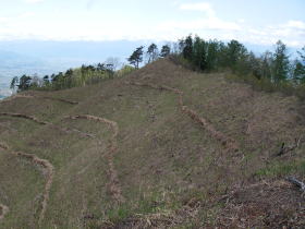 | 甲州高尾山への道からの眺め。斜面全体を刈り取ってある。植林の準備作業か。このままなら近いうちに花の名所になるかも。 |