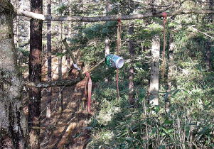 | 石保戸山がすぐ近くになったところで防火帯は左に曲がり下りになる。ちょっと下ると山頂から離れてしまうので引き返して道を探すと、この赤布があった。くすんだ3本のテープとアルミ缶だ。 |