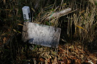 | 落ちていた山名プレート。藤尾山と天狗棚山の間で割れていたのを合わせて三角点に立てかけて撮影。 |