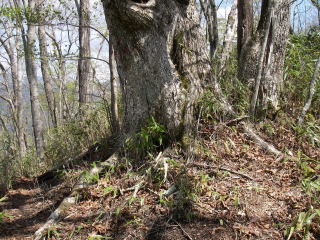 | 藤尾山に続く稜線に出たところ。帰路にここから下らずに稜線を進んでしまわないようにこの大木に赤ペンキの矢印があった。 |