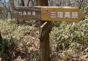 | 柳沢峠からちょっと登るとこの一方が林道、他方が三窪高原という分かりにくい道標があった。 |