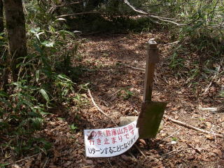 | 鈴庫山の方向には行き止まりで、Uターンすることになると書いてあり、道には倒木を積んで塞ぐ形になっていた。 |