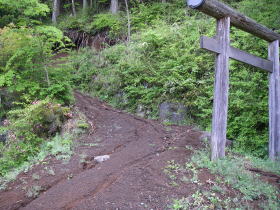 | 山中湖側からも峠に登る道はあるはずだと、廃墟になっている建物の方に向かうと、この鳥居の前に道があった。 |