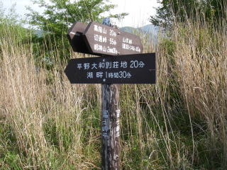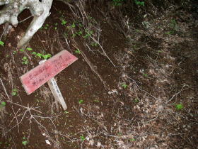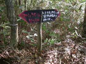 | 鳥居の前の道をちょっと登ると、平成17年と書かれたこの道標があった。山伏峠に登る道だ。 |