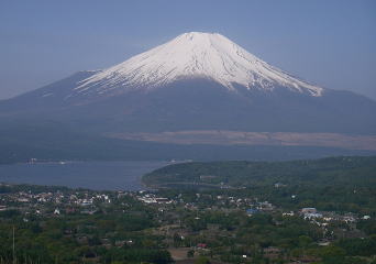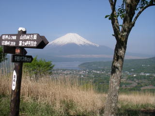 | 富士岬平、高指山など展望に利くところからは、山中湖を前景にした真っ白な富士山を見ることができました。真冬のように澄んだ空気ではありませんのでちょっと霞んでいましたが、そのせいでとても柔らかい感じに見えました。厚く雪に覆われている富士山が、ちょっと霞んで柔らかく見えるのは穏和な感じがして好きです。 |