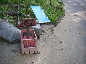 | 山伏トンネルの山中湖側の旧トンネルに通ずる廃道に車を止め、山伏峠に向かおうとするとこの『山伏峠 道志口 トンネル反対側』と書いた道標があった。 |