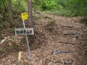 | 餓鬼岳の白沢登山口を見送ってこの登山口に車で向かうとき、この登山口の道標があるかどうかが分からなかったので、行き過ぎてしまうことを怖れて手前の『高瀬川線20号鉄塔』近くの駐車スペースに車を止め、林道をここまで歩いた。 この登山口の近くに5台ほど止められそうな駐車スペースが2ヶ所あった。 |