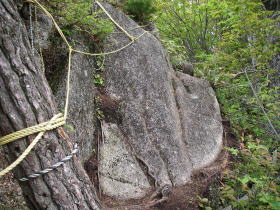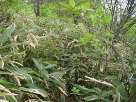 | 鉄塔より先は、道に笹が張り出すようになるが、段差の大きなところや危なそうなところにはロープが張ってあった。このように笹が張り出して道がほとんど見えないところもあったが、地面にはしっかりと道を確認でき迷う心配はなさそう。 |