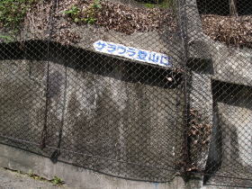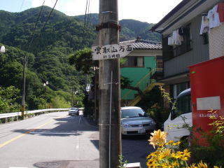 | 親川の青梅街道に下りたところにある道標。サヲウラ登山口と書いてある。2.5万図にはサオラと書いてあるが、現地の道標はサヲウラだ。ヲとオの違いも興味深い。 |