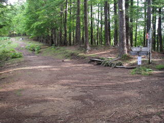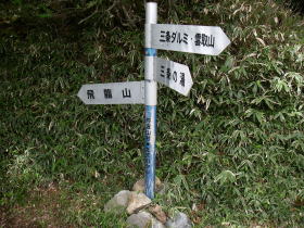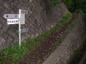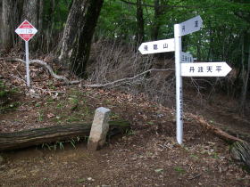 | 鴨沢からちょっと行くと道標があり林道から離れるが、また合流する。歩いてきた道は鴨沢への近道と書いてあった。ここでまた林道と離れ山道に入り、雲取山に向かう。 |