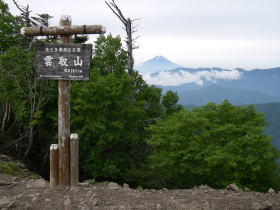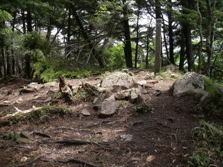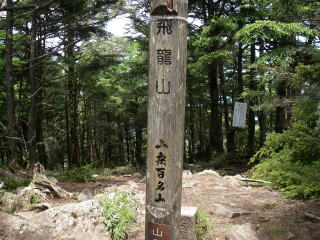 | 飛龍山山頂。飛龍権現神社から雲取山の方向に戻るような向きに登った。雲取山の方から尾根通しに行く道があるようだが、分岐に気付かなかった。山頂から尾根通しの道を見ると赤布があったので歩けそうだ。 |