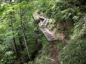 | 飛龍山に向かう道は主に尾根の南斜面あり、このような橋が随所にある。 |