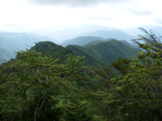 | ブナ坂を過ぎれば展望の利く尾根道になり、これから歩く飛龍山に連なる尾根がはっきりと見えた。 |