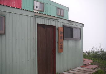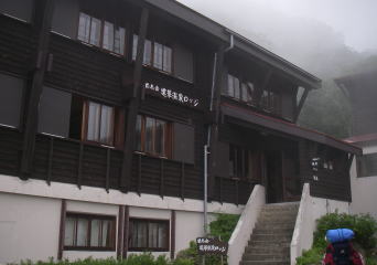 | 栂海山荘。遠くから見たときは赤い建物だったが、正面から見ると、赤ではなかった。 |