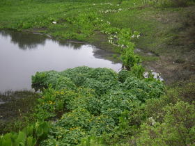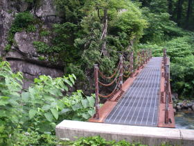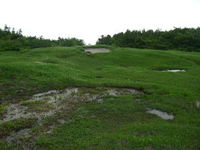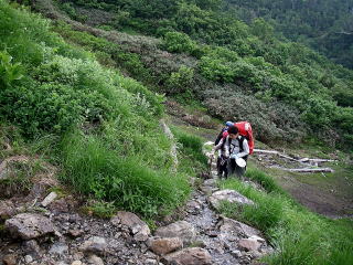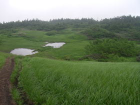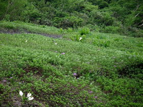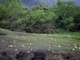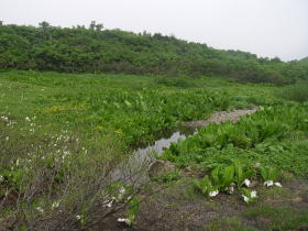 | 4時半にロッジを出発。キャンプ場を過ぎ、しばらく歩くと湿地帯が現れ、花がいっぱい咲いていた。だが早朝のため暗くて写真は撮れなかった。 湿地帯を過ぎ少し登りのところがあるものの、瀬戸川橋付近まで、ロッジからは300m程の下りだ。 |