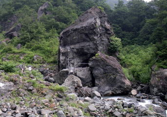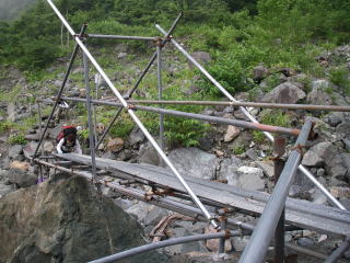 | ヒョウタン池を過ぎ、白高地沢に出合い、上流に向かって進むと、この大きな岩にかかった橋が見えた。建築用の足場を使って組み立てた橋のようだ。 |