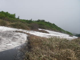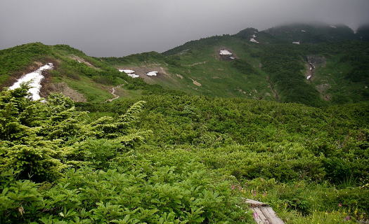 | アヤメ平から黒岩山付近までの景観。雪渓は急速に融けているせいか踏み跡はほとんど残っていないので、赤布を探しながら歩いたが、赤布のないところもあり慎重にコースを選びながら歩く。途中に木道工事の作業小屋があったので、間もなくこのあたりも木道の道になるのだろう。 |