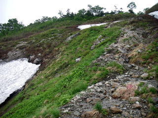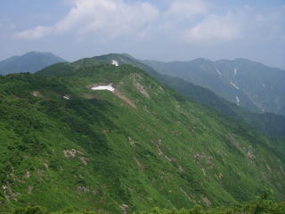 | 五輪尾根の景観。最近まで雪に覆われていたところが多く、ミズバショウやハクサンコザクラなどの群落もあった。清水などもあり、花を愛でながら休憩すると、つい時間が長くなってしまう。雪もだいぶ残っていて、メンバーが数えたところによると、千代ノ吹上までに13回の雪渓のトラバースがあった。 |