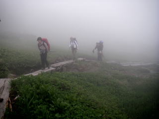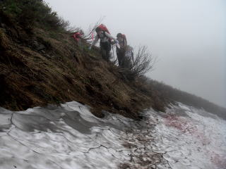 | 五輪尾根の道。千代ノ吹上に近づく頃にはガスが出てきて風の強くなってきた。 |