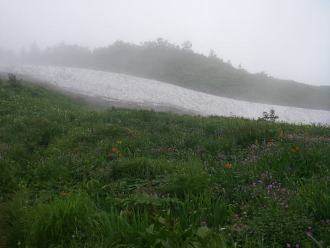 | 朝日小屋で教えられたように、雪田の下端に2m位の段差があり、雪田の右端までトラバースしてアヤメ平に下りる。 アヤメ平は花が沢山あるお花畑で、ここに来たことを誇らしく思えるような素晴らしいお花畑だ。この先、黒岩山付近までは雪渓あり、池塘有りのお花畑が続き、こんな素晴らしいところを歩ける喜びをかみしめながら歩く。 |