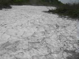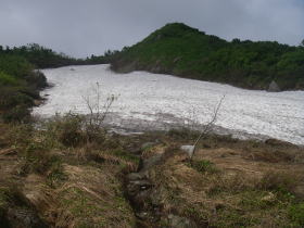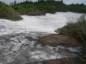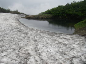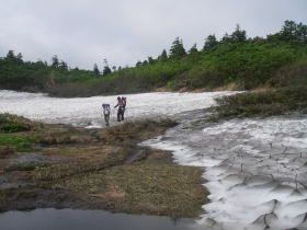 | 雪渓に下りるときは、雪渓の縁は堅く凍って滑りやすいことが多いので慎重に。 |