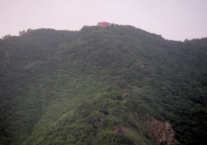 | 山荘を発ってしばらく歩いてから振り返ると赤い栂海山荘が見えた。もうこんなに下ってしまったという感じだ。 |