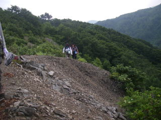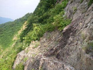 | 下駒ヶ岳の山頂付近の岩壁。はるか下の方まで崩れている。下駒ヶ岳への登りは急で大汗をかいた。 |