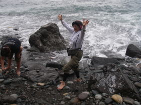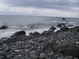| 登山口から遊歩道を100mくらい下って親不知海岸へ。海に素足を入れて、海岸まで歩き通したことを喜ぶ。 |