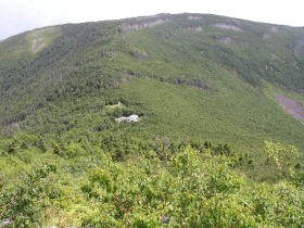 | 振り返ると蓼科山荘が見え、背景の前掛山にもくっきりと縞枯れが見えた。 |