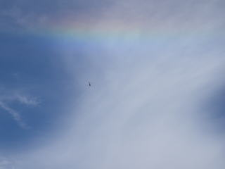 | 太陽を取り囲むようにできる日暈が雲のある部分だけにできたものか。 写真の中央付近の黒いシミは、拡大してみるとトンボだった。トンボが写るなんていかにも夏山らしい。 |