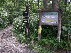 | 明け方近くまで雨が降っていたが、日の出の頃には止んだので天気が良くなることを期待して出発する。登山道に入ると木の葉から落ちてくる雫で濡れるので傘をさす。だが大沢小屋に近づく頃から弱い雨が降り出す。 |