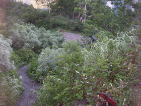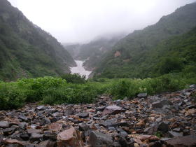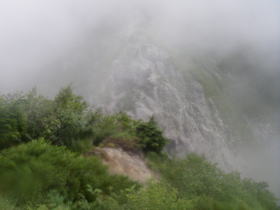 | 悪天候がしばらく続くという天気予報なので、水晶岳、赤牛岳を経て黒部ダムに行くのを断念して、高瀬ダムに下山することにする。 雨は降っていたものの、前日と比べると風が弱くなっていたので、歩くのには全く支障がなかった。烏帽子小屋からちょっと下ったところで雨具の上着を脱ぎ、傘をさして歩いた。ブナ立尾根の道はよく整備され、とても歩きやすく、意外なほど早く高瀬ダムに着いてしまった。 ダムにはタクシーが止まっていて、待つことなく扇沢行きのバスの停留所まで行ってもらえたのでとてもあっけなく扇沢に着いてしまった。これで8月の山行が終わってしまったかと思うとさびしかった。 大町温泉の薬師の湯で汗を流し、ひげそりをして帰路に。 |