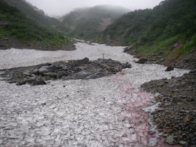 | 沢に下りたところから針ノ木雪渓を見上げる。ここから数分行ったところが雪渓への取り付き点。取り付き点で雨具の上着だけを着け、アイゼンをつけ、傘をストックに持ち替えて進む。 |
