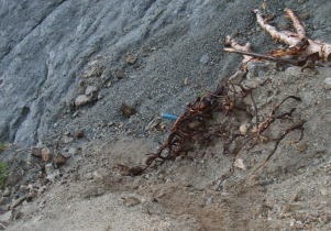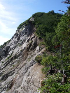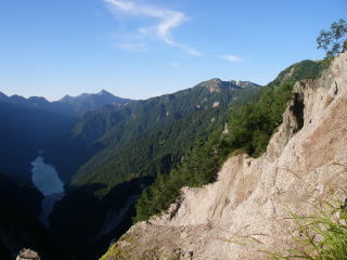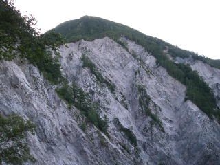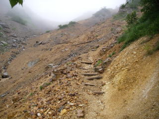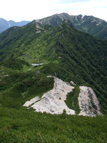 | 船窪乗越から見る崩れた山肌。この縁を歩くところがあったが、こんなに崩れているとは気付かなかった。 |