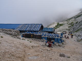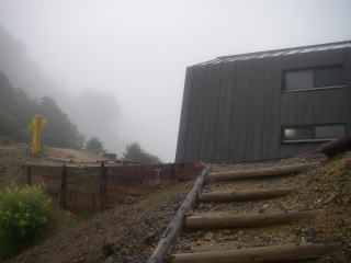 | 野口五郎小屋。小屋の前の谷にはガスが掛かって来て、翌日の天気が気になる。 |