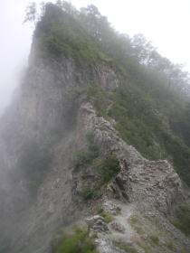 | 北葛乗越や七倉乗越などの岩場もガスと雨でよく見えなかったが、道を忠実に辿って行くと、難所には鎖、ロープ、梯子などがあって通過できた。遠目に見たときにはどこに道があるのか分からないような地形で、道がついていることに感謝しながら歩いた。 |