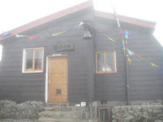 | 日の出前に小屋の外に出てみると、雲一つない快晴で東の地平線は朝焼けで輝いていた。こんな好天になることは全く予想できなかった。 小屋を発つのは5時の朝食を食べてからと決めていたが、10分ほど早く朝食の準備ができ、5時には出発できた。出発の時、小屋の方が出てきて鐘を鳴らして見送ってくれた。 |