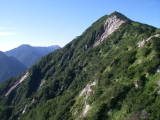 | 不動岳への登りから見る蓮華岳(左)と北葛岳 |
