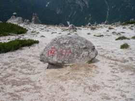 | 山頂からの展望は素晴らしく、三ッ岳、水晶岳、烏帽子岳、赤牛岳、南沢岳、薬師岳、越中沢岳、鳶岳、鷲岳、獅子岳、龍王岳、立山三山、剱岳、針ノ木岳、鹿島槍ヶ岳、蓮華岳、北葛岳を見ることができた。 |