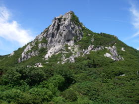 | 不動岳。山頂の肩にある岩のかたちが面白く、いい形の山だ。 |