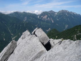 | 岩に挟まるように烏帽子岳山頂に立ってに見る剱、立山方面 |