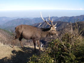 | 塔ノ岳山頂は冷たい風が吹き、ゆったりと座って休憩している人が少なかったが、鹿は人を無視するようにじっとしていた。丹沢では群れを作らない鹿が多いようだ。 |