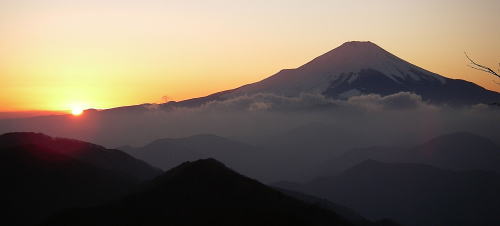 | 鍋割山荘より見る富士山の裾野に沈む夕日 |