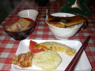 | 夕食は鰻丼、天ぷら、おでん、唐揚げなどで豪華。小屋の名誉のために付け加えるとこの写真は私はだいぶ食べてしまってから撮ったものです。 |