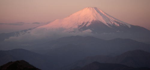 | 朝日を浴びて赤く染まった富士山。6:50頃。ちょうど小屋の朝食の時間だった。 |