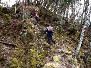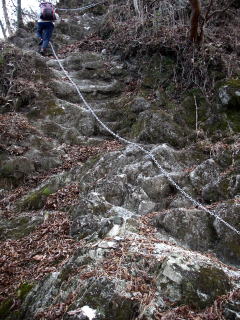 | 鍋割峠、雨山峠の間にある鎖場。ザラザラとした岩で滑りにくいので安心だが、崩れやすい岩なので砂になってたまっているところを踏むと滑りやすいかも。 |