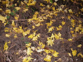 | 杉の落ち葉の上の黄色い落ち葉 |
