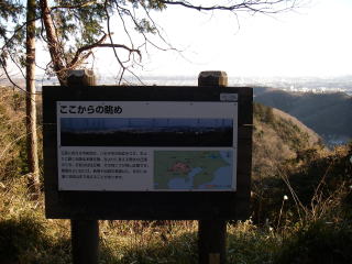 | 稲荷山の展望ガイド。八王子の街並みが見え、展望の良い日は池袋や新宿の高層ビル、更には筑波山が見えると説明されている。 |